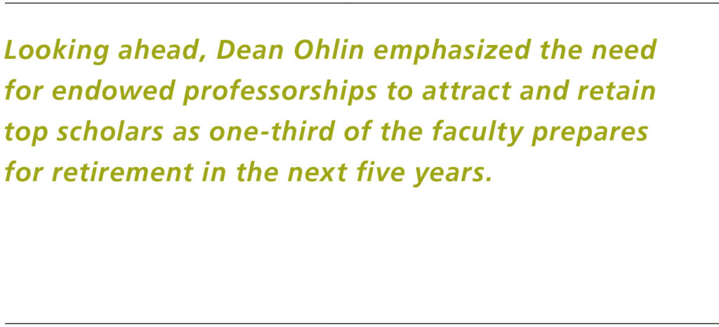 At the Alumni and Faculty Luncheon on Friday, Ohlin outlined Cornell Law’s strengths in teaching, clinics, and scholarship. He noted that the Class of 2024 led the nation in Big Law placement, with 78 percent entering firms of more than 250 lawyers and 96 percent securing bar-required jobs. Looking ahead, he emphasized the need for endowed professorships to attract and retain top scholars as one-third of the faculty prepares for retirement in the next five years.