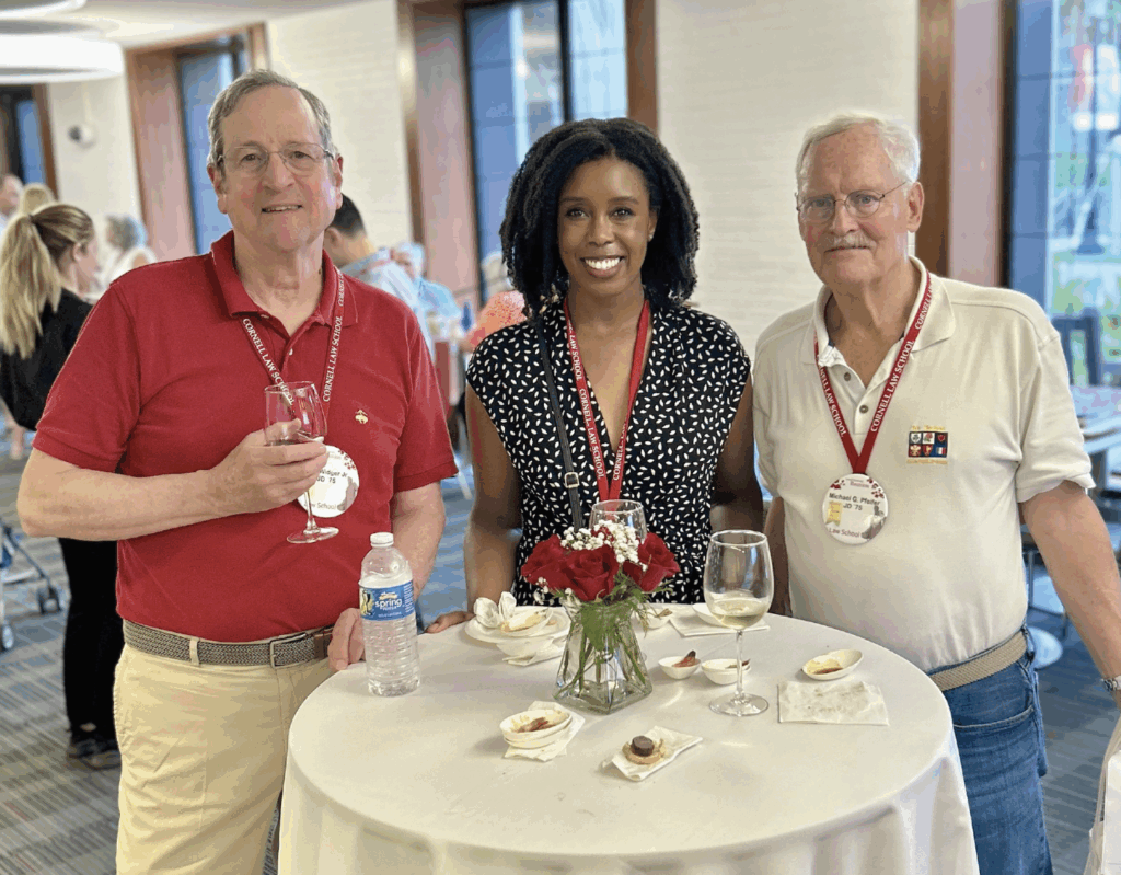 Alumni also returned to the classroom for a pair of continuing legal education programs. On Friday, Edward Cornell Law Librarian Kim Nayyer examined the promise and perils of generative artificial intelligence in legal research, highlighting how large language models both transform and complicate the practice of law by raising questions of accuracy, bias, and professional responsibility. Later, trade law expert and Cornell Law alumnus Leslie Alan Glick ’70 explored “The Return of Donald J. Trump: Trade and Tariff Implications,” reviewing the former president’s reliance on tariffs as a negotiating tool, their impact across industries from steel to semiconductors, and the legal challenges that continue to surround emergency tariff powers.
