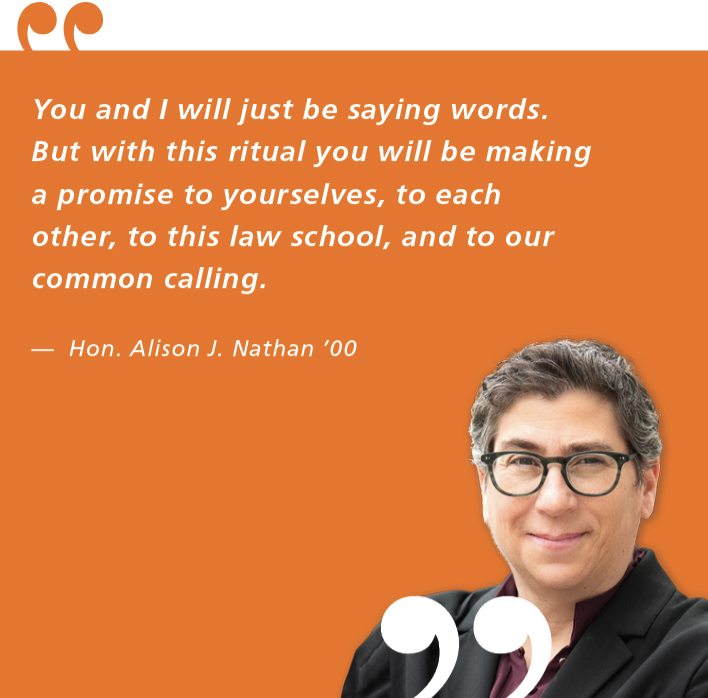 “So too the oath you are about to take. You and I will just be saying words. But with this ritual you will be making a promise to yourselves, to each other, to this law school, and to our common calling.”