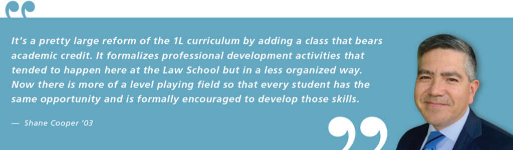 “It’s a pretty large reform of the 1L curriculum by adding a class that bears academic credit,” said Cooper. “It formalizes professional development activities that tended to happen here at the Law School but in a less organized way. Now there is more of a level playing field so that every student has the same opportunity and is formally encouraged to develop those skills.”