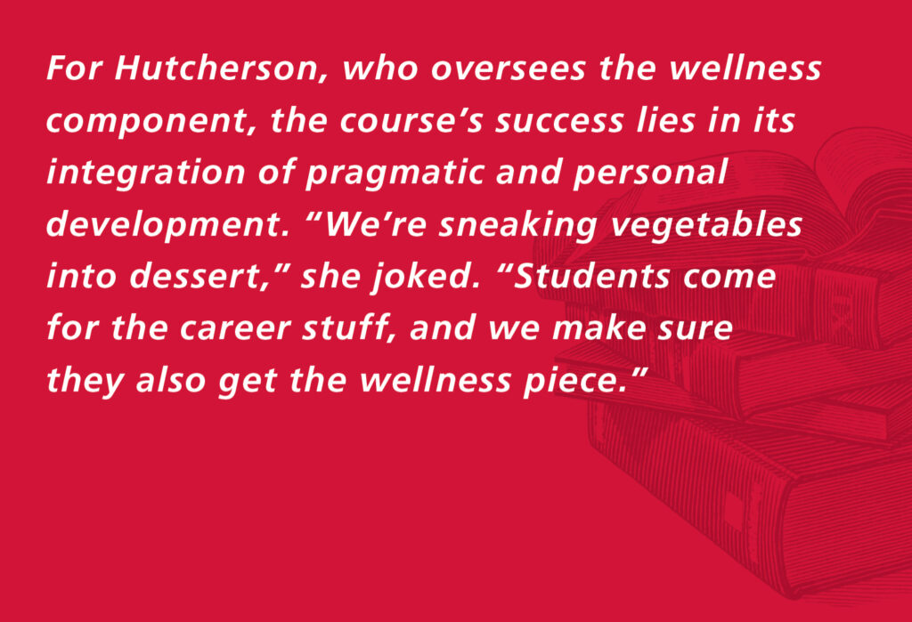 For Hutcherson, who oversees the wellness component, the course’s success lies in its integration of pragmatic and personal development. “We’re sneaking vegetables into dessert,” she joked. “Students come for the career stuff, and we make sure they also get the wellness piece.”