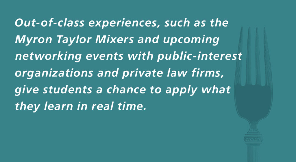 The course began with a lecture by Professor Brad Wendel on “Professional Responsibility and Lawyers in the Best Sense,” followed by workshops on résumé and cover-letter writing, mental health, and identity in the legal profession, each of which were followed by reflective writing assignments. In the spring semester, the course will delve into more advanced topics related to wellness, understanding the profession, networking, mentorship, and effective communication skills. Out-of-class experiences, such as the Myron Taylor Mixers and upcoming networking events with public-interest organizations and private law firms, give students a chance to apply what they learn in real time.