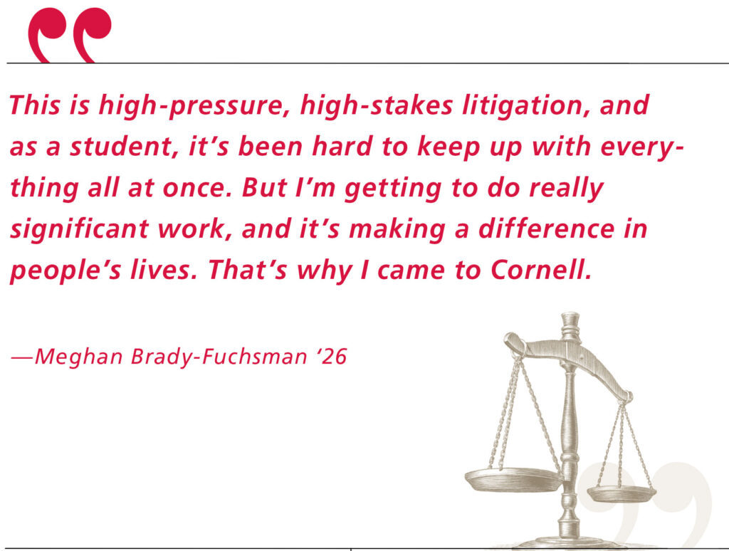 “It’s been very challenging,” says Meghan Brady-Fuchsman ’26, who spent March drafting witness statements and several urgent filings. “This is high-pressure, high-stakes litigation, and as a student, it’s been hard to keep up with everything all at once. But I’m getting to do really significant work, and it’s making a difference in people’s lives. That’s why I came to Cornell.”